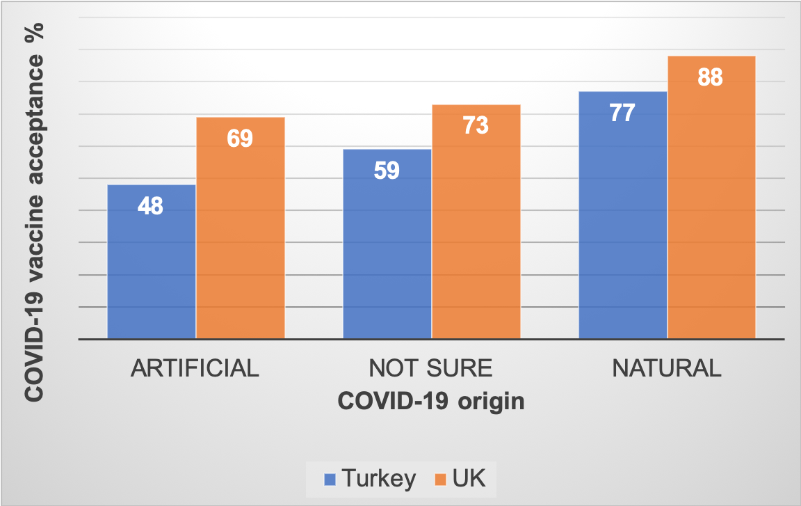 We examined the factors associated with acceptance of a COVID-19 vaccine. One of the key factors that explained the probability of vaccine acceptance was a person’s belief on the origin of the novel coronavirus. Only 48% of the people in Turkey and 69% in the UK who thought the virus origin to be artificial accepted COVID-19 vaccination. Vaccine acceptance rates rose to 77% in Turkey and 88% in the UK if a person believed that the virus originated naturally in wildlife.