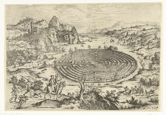 A group of hunters view the labyrinth from a hill. The labyrinth is located in a bay and is accessed through a drawbridge from the land. There is a town on the bay and a castle on the left.
