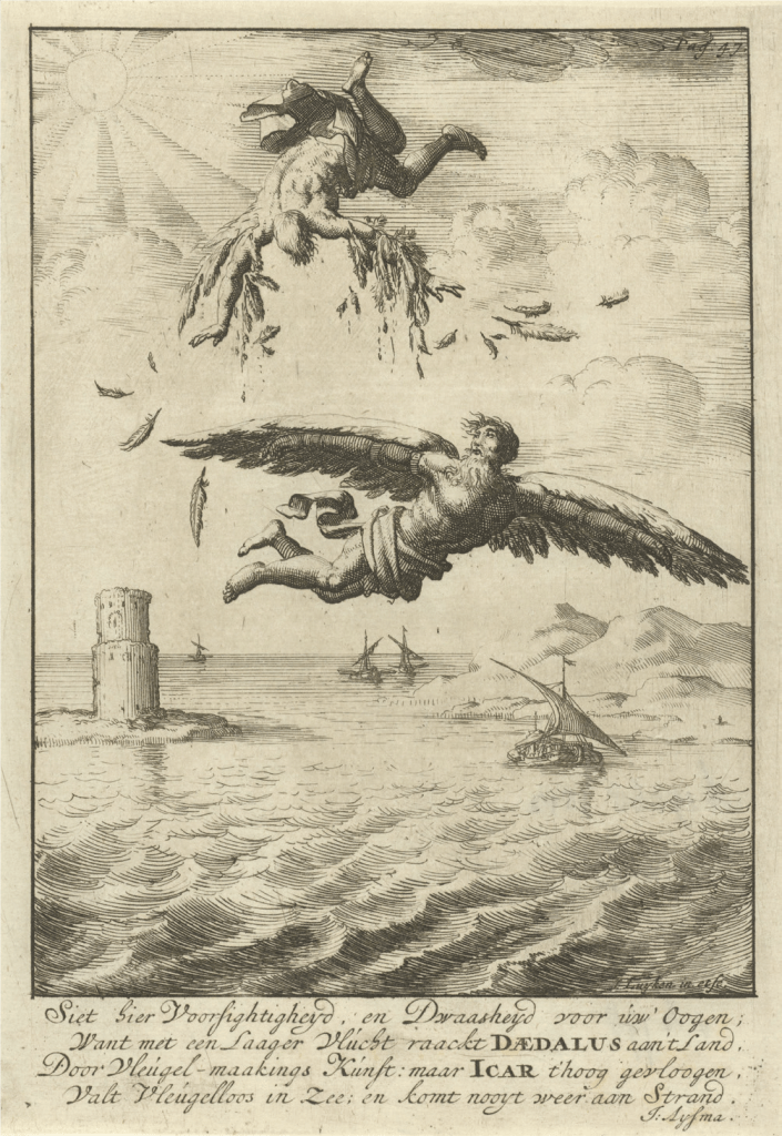 The fall of Icarus by Jan Luyken (1686 CE). Daidalos glances up and is shocked to see Ikaros tumbling out of the sky.