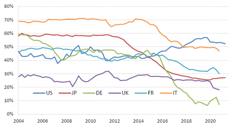 From the market side there is a huge appetite for highly liquid and highly rated EU debt. This is evident from the high levels of oversubscription (over 11 times) for both NGEU and SURE (Support to mitigate Unemployment Risks in an Emergency) transactions. Factors such as the search for safety, the scarcity of safe assets, and collateral needs contribute to this demand. For example, with regards to the scarcity of safe assets, there is only around 10% of German debt that is actually available to all investors (Figure 1). Having an EU safe asset would contribute towards reducing this scarcity. But also in terms of liquidity, the EU’s debt is now on a par with that of sovereigns, a big shift compared to where Europe was pre-pandemic.