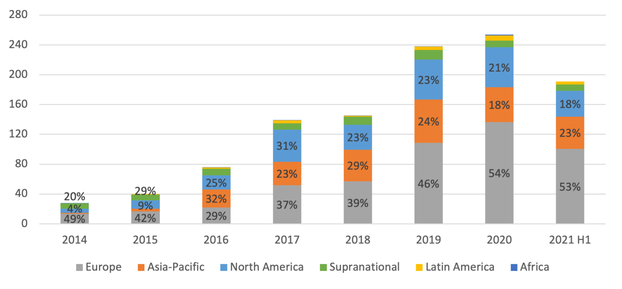 Something that should not be neglected, given that Europe wants to establish itself as a leader in green bonds, is the fact that about 30% of the EU debt is green. In terms of year-to-date issuance of ESG bonds, Europe is leading the way accounting for over half of the global issuance (Figure 2). In addition, 60% of that is accounted for by sovereign governments or sovereign and supranational issuers.
